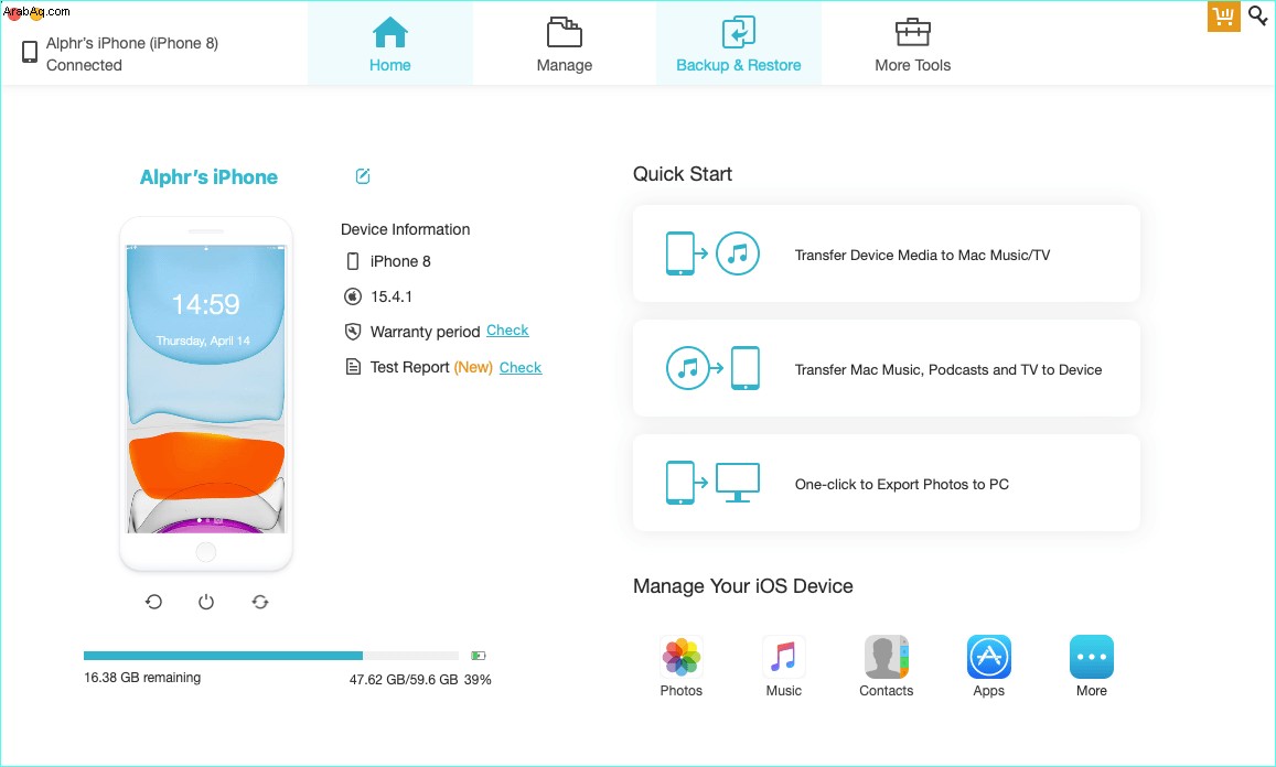 إذا كنت تريد تحديد الملف المراد نسخه احتياطيًا ، فانقر على "نقل الصور" أو "مدير الموسيقى" أو "الفيديو" أو "الملفات" واختر البيانات المراد نقلها إلى جهاز الكمبيوتر الخاص بك. لي> كيفية عمل نسخة احتياطية من iPhone على جهاز كمبيوتر بدون USB أو كابل
