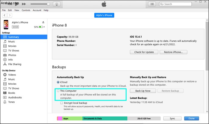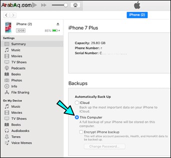 في علامة التبويب "النسخ الاحتياطية" في iTunes ، انقر فوق زر تبديل "هذا الكمبيوتر".