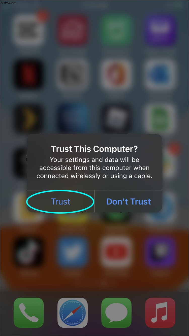 سيسألك iPhone عما إذا كنت تثق في الكمبيوتر. اضغط على "الثقة".