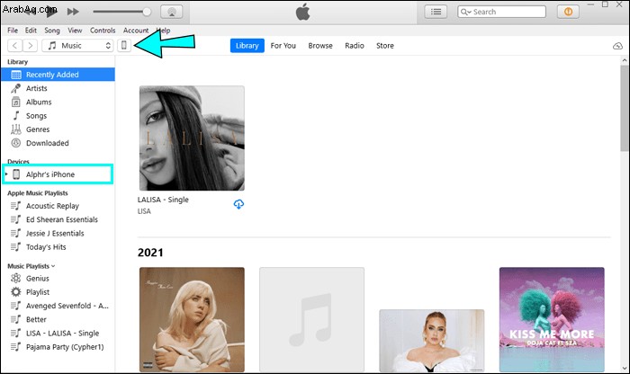 في iTunes ، انقر فوق اسم هاتفك في القائمة الموجودة على اليسار. إذا لم تتمكن من رؤيته هناك ، فانقر فوق رمز الهاتف المحمول في الجزء الأيسر العلوي من النافذة.