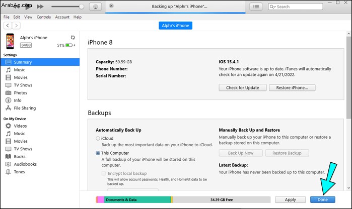 انتظر حتى ينتهي شريط التقدم. انقر فوق "تم". كيفية عمل نسخة احتياطية من iPhone على جهاز كمبيوتر يعمل بنظام Windows