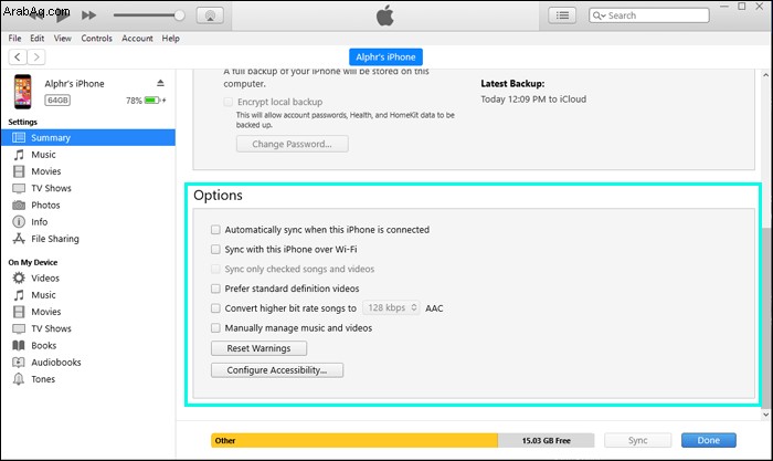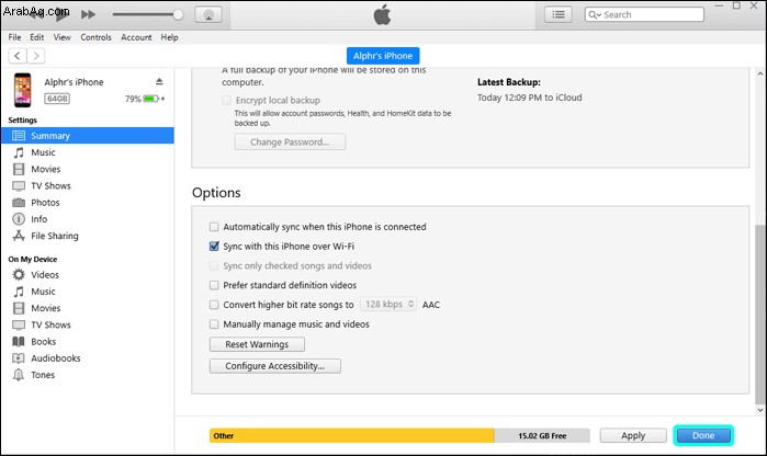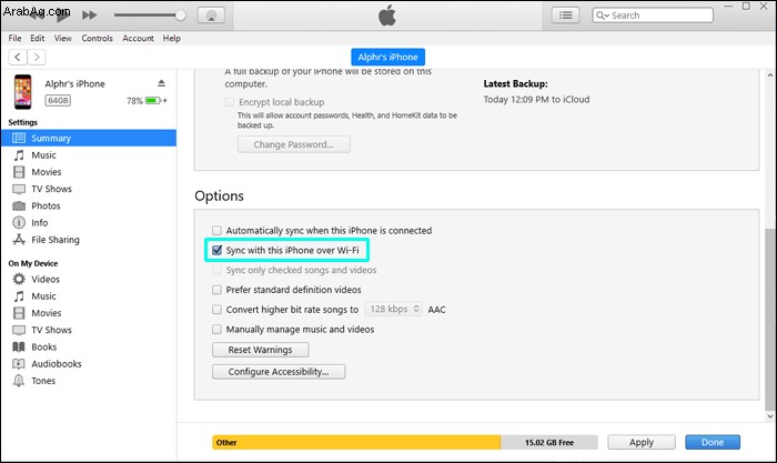 بدّل علامة الاختيار على "المزامنة مع iPhone هذا عبر Wi-Fi".