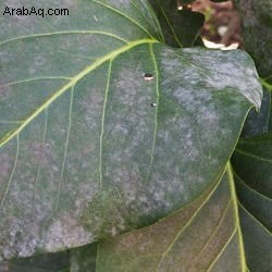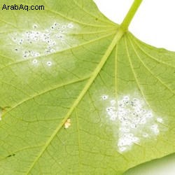 الأعراض: طلاء مسحوق أبيض إلى رمادي ، خاصة على الأوراق الصغيرة. المناطق المتقرحة على حواف الأوراق التي تجعلها تتجعد لأعلى.